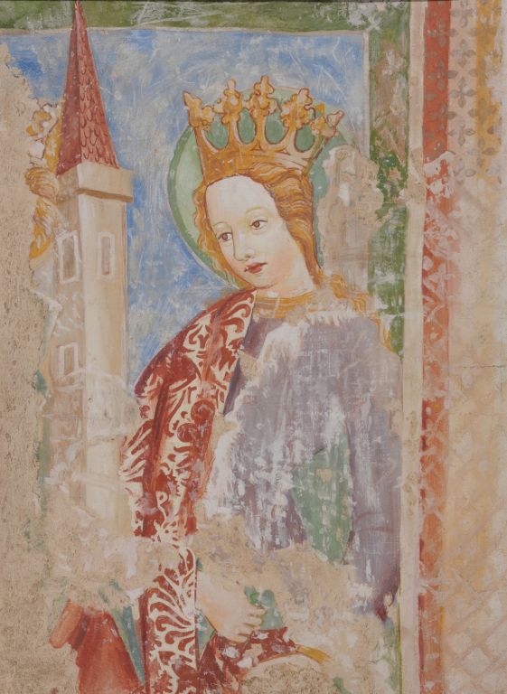 In 1453, Master Bolfgang painted the entire eastern bay of the north nave of the Crngrob pilgrimage church. In addition to two scenes (Nativity of Jesus, Adoration of the Magi), the triangular vault sections are adorned with depictions of saints. Among them is a group of four full-figure saints with crowns, set against a neutral blue background: on the far left, St Dorothea, in a slight bow, extends her right hand towards a child offering her a basket of flowers; next to her is St Catherine, holding the torture wheel with her right hand; then St Barbara with a tower in her left hand; and finally St Margaret with a dragon at her feet. The virgins are dressed in simple, monochrome garments, with the exception of St Margaret, who wears a lavish cloak with stencilled ornaments combining palmettes, stylised pomegranates and pairs of birds with outstretched wings.
