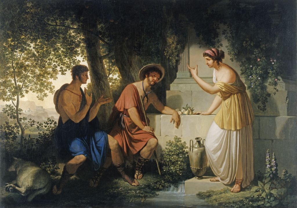 Milon and his friend came from Milet, bringing a present to Apollo. Through a laurel garden they beheld the god's temple by the sea in the distance. The day was hot and the path was dusty and they hurried on to reach the plantation where they saw a clear, cool spring and fruit - bearing trees. Under the trees where they chose to rest, there was a tombstone inscribed: " Here lie the ashes of Mycon! All his life was goodness itself. He wished to do good also after his death, so he had a water spring arranged here and trees planted. " A beautiful girl - Mycon's daughter- in- law - came to fetch water. She told the two pilgrims about Mycon's goodness and about his son, the best and the most handsome of all the shepards, who had married her although she was poor.