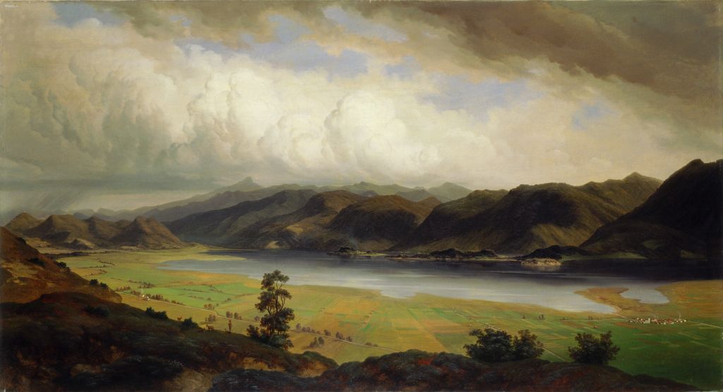 Lake Cerknica is the reflection of two, usually separate approaches in painting: panoramic views from summits like those that Pernhart sketched on his own hillwalking excursions, and observations of meteorological phenomena, including storms. The artist’s notebooks contain sketches of clouds which he drew from nature, occasionally adding the place, time and date. Pernhart, systematic both in character and in artistic expression, did not attempt to heighten such romantic scenes – like his painting Lago di Fusine in Stormy Weather, Lake Cerknica remains on the rational side of subliminality, in other words the wonder that the power of nature evokes in a human being. Lake Cerknica also reveals another popular nineteenth-century theme: the tension between nature and civilisation. The cultural landscape in the karst polje is conditioned by the intermittent nature of the lake, a phenomenon first studied in the seventeenth century by Johann Weikhard Valvasor, whose work on the subject earned him an invitation to join the Royal Society in London. In the nineteenth century, just as it is today, the clash between man and the environment was a consequence of industrial development. We find evidence of this hidden conflict in several of Pernhart’s works, including in images of industrial plants that transform their surroundings. A good example from the National Gallery collection is Panorama from Šmarna Gora, in which the views of the mountain peaks and little villages that still exists today almost cause us to overlook the areas of cleared woodland that cut into the green hills surrounding Ljubljana. Pernhart was familiar with all the principal tendencies of the Biedermeier/Romantic art, yet he used them with restraint, perhaps out of deference to the provincial environment in which he sold his works and as a reflection of his own craftsmanlike prudence.