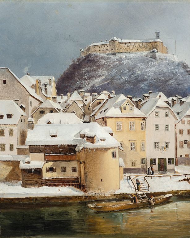 Interest in landscape first appeared as the background of portraits; towards the mid-century first autonomous city vedute emerged. The Biedermaier landscape is idyllic, descriptive, and furnished with staffage figures. Painters were attracted by tourist destinations and locations that were related to homeland identity: Mt. Triglav, Lake Bohinj, Bled. Anton Karinger and Marko Pernhart established themselves as explicit landscapists. The latter became famous for his multi-part panoramas from mountain peaks.