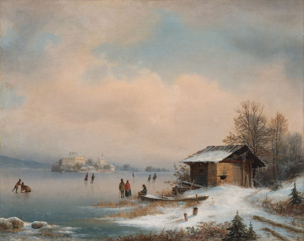 Interest in landscape first appeared as the background of portraits; towards the mid-century first autonomous city vedute emerged. The Biedermaier landscape is idyllic, descriptive, and furnished with staffage figures. Painters were attracted by tourist destinations and locations that were related to homeland identity: Mt. Triglav, Lake Bohinj, Bled. Anton Karinger and Marko Pernhart established themselves as explicit landscapists. The latter became famous for his multi-part panoramas from mountain peaks.