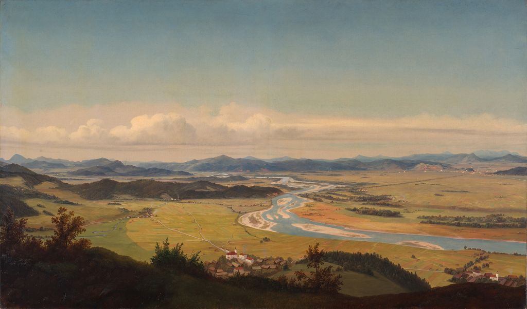 Interest in landscape first appeared as the background of portraits; towards the mid-century first autonomous city vedute emerged. The Biedermaier landscape is idyllic, descriptive, and furnished with staffage figures. Painters were attracted by tourist destinations and locations that were related to homeland identity: Mt. Triglav, Lake Bohinj, Bled. Anton Karinger and Marko Pernhart established themselves as explicit landscapists. The latter became famous for his multi-part panoramas from mountain peaks.