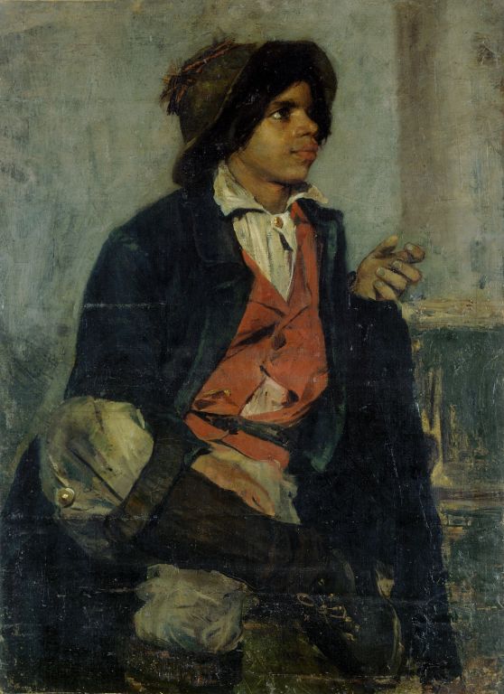 Neapolitan Boy. We do not know if Petkovšek painted the boy on one of his study tours to northern Italy (where migrants from the south still arrive today) or if he actually visited the regions south of Rome. The picture might also be Petkovšek's rendition of a work by another painter. Regardless, this is one of the painter’s better quality works, and the unfinished painting reveals none of the technical shortcomings that frequently pervade Petkovšek’s canvases. The small size and the simplicity of the subject, painted in dark shades, undoubtedly contribute to the successful result.