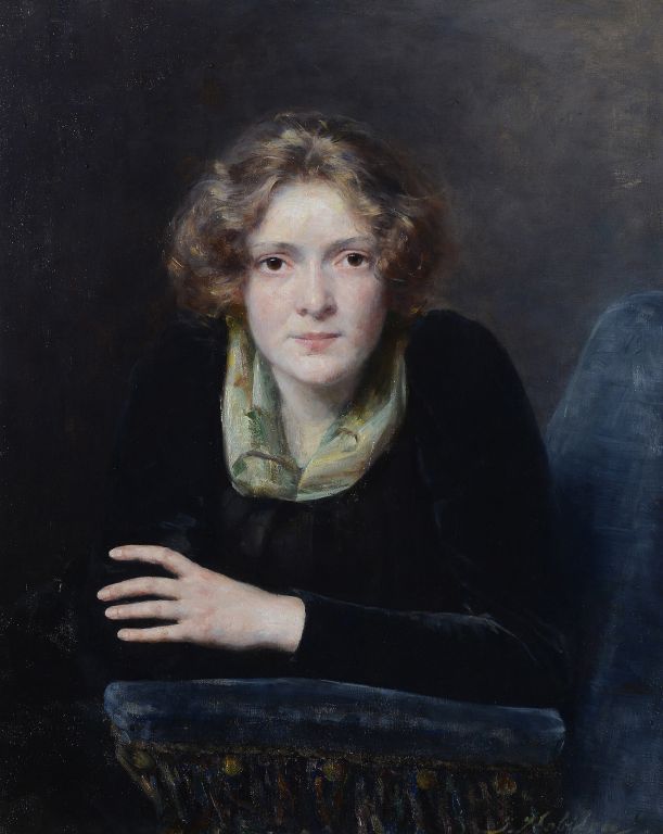 The young woman sits with arms folded on the padded arm of a chair and gazes confidently towards the viewer. Together with Parisian Vegetable Seller and, in particular, Boy in a Sailor Suit, the painting forms part of a trio of dark-blue Parisian portraits which Ivan Kobilca painted in parallel with her bright plein air and blue-and-white works.