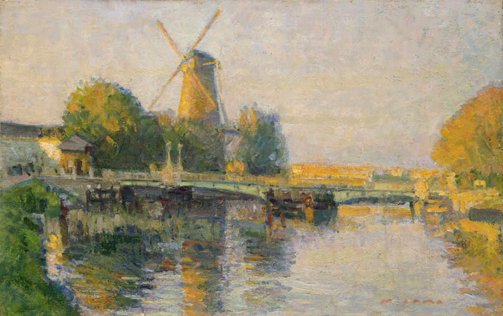 Jama painted a 17th-century bridge called the Hoornbrug, which, halfway between Delft and the Hague at Rijswijk, crosses the Vliet canal, leading from Rotterdam and splitting off towards Leiden before reaching the Hague. His Motiv iz Holandije (Motif from Holland) is not identical to his Most na Holandskem (Bridge in Holland) from 1920 (catalog 1942, no. 39). Tomaž Brejc knew this work as the (Dvižni) Most na Holandskem (The (Draw-)bridge in Holland), noting that Jama at last took lessons from van Gogh’s work during his second stay in The Hague 1915−1922. This supports attempts at dating the work to Jama’s first trip to Holland in 1910, when he still held Monet as the undisputed authority. The mirror-image composition with the towering (corn) windmill, the iconic emblem of the Netherlands, was certainly inspired by Jacob van Ruisdael’s Windmill at Wijk bij Duurstede when Jama first arrived in this new land. Otherwise, Jama looked to Monet in studying reflections on the surface of water, as we also find in the painting Pristanišče v Amsterdam (Harbor in Amsterdam) (1910). Monet’s paintings from Zaandam and Vétheuil in the 1970s, as well as later works, serve as an excellent comparison of how to treat natural phenomena observed in situ, while composing a painting with the vertical and horizontal both in the foreground, which then echoes in the horizon on the right, appears to be one of Jama's inventive sparks.