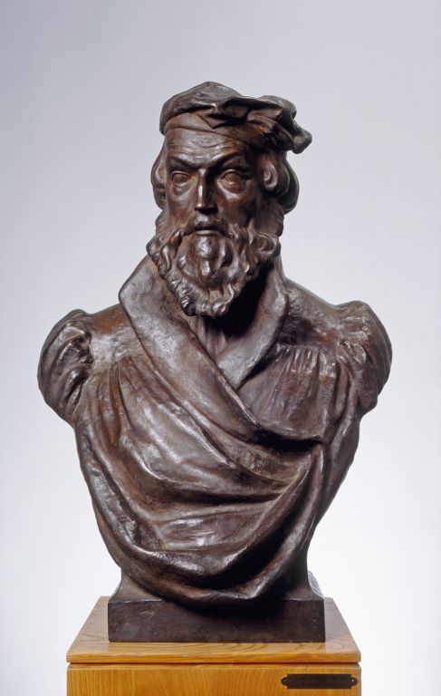 Peruzzi’s work was characterised by a calm realist tone with Secession-style poetic elements. In 1907, the sculptor created an academic realist bust of Primož Trubar. The full bust shows the father of Slovenian literature wearing a distinctive headdress and priestly vestments. The bearded figure with head turned slightly to the right offers deep psychological insight into its subject. The sculptor aimed to depict Trubar in active contemplation, likely at the moment when he understood that he could advance Protestantism by using the Slovene language in print.