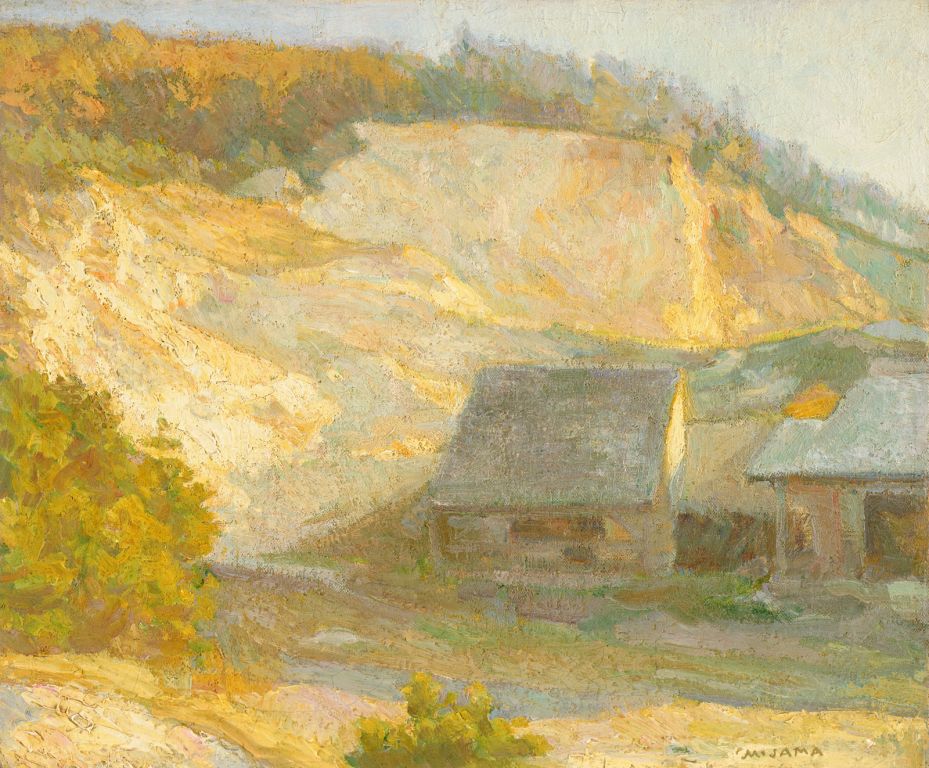 This painting, entitled Kamnolom (Quarry), was likely produced in the vicinity of Gaaden, where Jama and his family spent the better part of 1908. Still today they grind the dolomite rock from the hills between Gaaden and Mödling into gravel, and they used to bake it to produce lime and plaster as well. This painting was identified in a letter to Jakopič from 1909, when the artist mentioned it as a candidate for state acquisition, but later he actually sold the piece The Winter Sun (Willows). He was supposed to exhibit Kamnolom in Hagenbund at the end of that year, but the exhibition ran out of space. Thereupon he mentioned the painting another 2 times in May of 1911 after returning from Holland, again in the context of state acquisition. In 1914, he likely brought it with him to Holland and sold it there, as the National Gallery in Slovenia acquired it from the Dutch market. Kamnolom was painted as a photograph, lacking any compositional hierarchy. The work’s diagonals intersect at the edge of the small outhouse’s roof. Here, too, the successive bands of light and shadow work to give the work a planar depth of space. The quarry loses its meaning as a place of work and a blight on the landscape, remaining just a slope of whitened stone and a game of illumination and the tenebrous, transforming the subject into sensual pleasure through its festive light. The violet hues in the long shadow extending over the outhouse on the right remind us of a similar detail in the Most na Dobri.