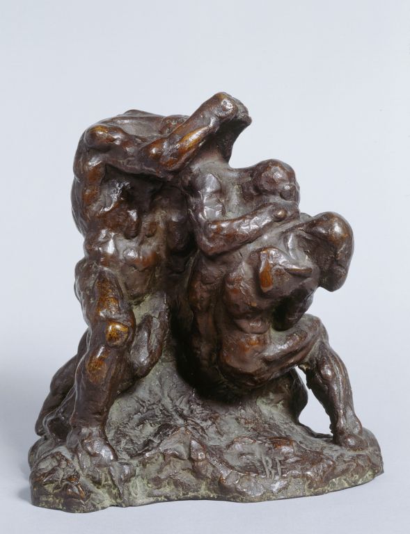 The dynamic composition of the pyramidal group of three male figures, who are either wrestling each other, as the title would suggest, or working together to pull a rope, can be interpreted in different ways. The popular motifs of fighters, wrestlers, fishermen and toilers allow the sculptor to accentuate the muscular forms of male figures during physical exertion.