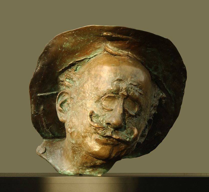 Contrasting with the imposing bust in Munich, this sculpture is more intimate, centering only on the artist’s head, cocked slightly to the left. The portrait radiates with Begić’s artistic range, refinement, attention to detail, and capacity for perception. He shows the artist in his eminent pose, handlebar mustache groomed upwards, circular spectacles, and a tophat, echoing the gilded halo of a saint. The sculptor captured the painter’s facial features in a vividly rugged form, attempting to capture in the process Ažbe’s majestic characteristics.