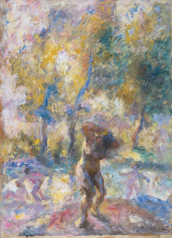 Jakopič produced several versions of his Bathers (Kopalke) during the first two years of WWI, perhaps with less success than his first attempt from 1905. He recreated popular motifs due to demand, with some of them reaching over 20 different versions. This painting in a considerably smaller format is a later work, most likely produced upon the express desire of friend and collector Dr. Fran Virant. Jakopič completely changed the color scheme. The blue, yellow, and pink palette with plenty of white does not provide the same emphatic experience as the work from 1905, but its expression is completely dominated by the painting technique, which, although fragmented, models the female form in the foreground with far greater ambition. For this work especially there are several late studies found in Jakopič’s estate, dated to just before this work was produced. In the last decade of his life, Jakopič worked almost exclusively in his studio. Alongside mostly floral still-lifes, he also revisited motifs from his youth, producing late works with common stylistic characteristics, such as his Resting Reapers (Počivajoči Kosci) from the Ljubljana City Museum, which he reproduced in the mid-1930s in large format.