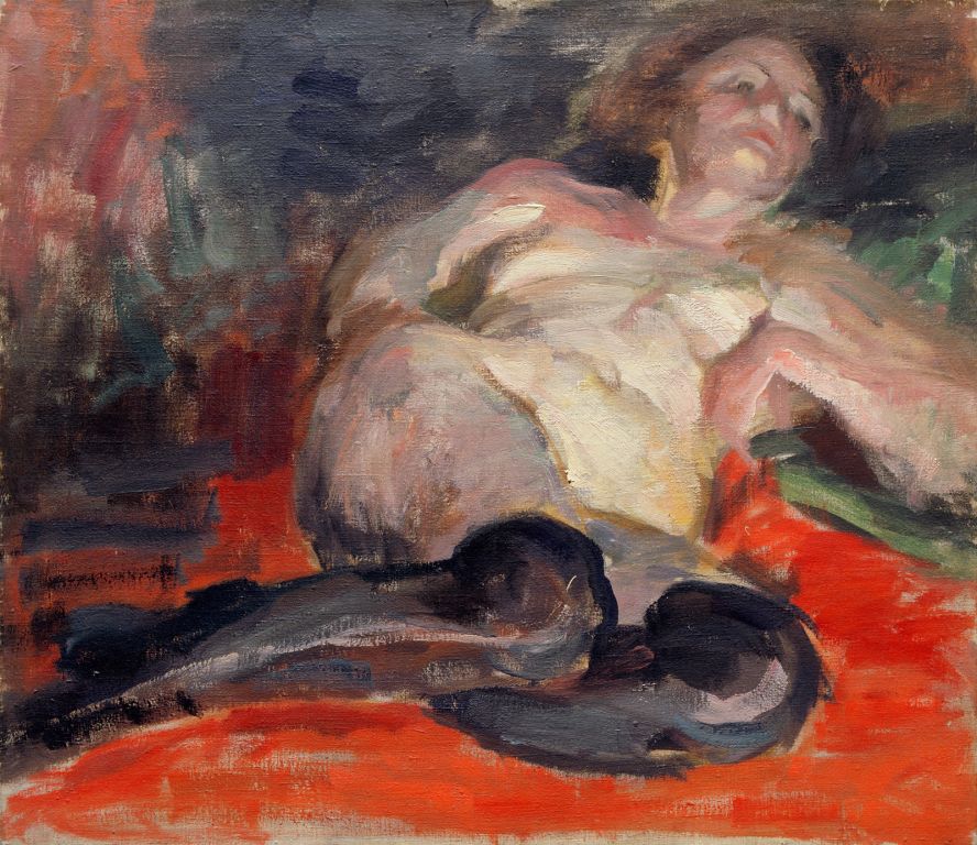 Sternen’s Reclining Female Nude in black stockings represents a step in this direction. The shortening of the legs from the knees downwards is a continuation of the stylistic formula employed in At the Mirror (1926). The painting is executed with short strokes of a drained brush in an automatic rhythm of paint applications. The black of the stockings is both subordinate to and enhanced by the complementary contrast of red and green. One would not object if someone were to describe the painting as unfinished. Art historian Tomaž Brejc pointed out how mainstream and modern the photograph seems in comparison to the painting. Of the latter he wrote: “In Sternen’s painting, however, regressive painterliness weakens in intensity and inhabits a stylistically undefined space between the Impressionistic tradition and the refined New Objectivity of the 1920s.” After this work, Sternen would begin mass-producing small-format paintings, usually on plywood, that could more easily be converted into money.