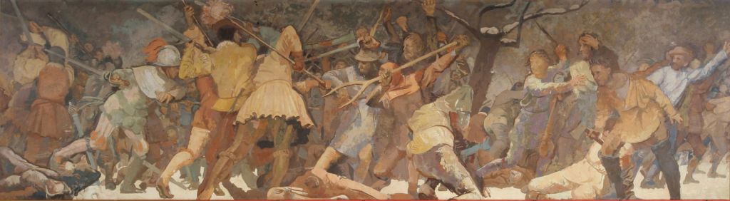 The Battle depicts the first clash between the peasants and the noble army during the Croatian–Slovenian Peasant Revolt led by Matija Gubec. Near Krško, the rebellious peasants were intercepted by the Uskok captain Jobst Joseph von Thurn and defeated. Those who were not killed or drowned in the Sava fled back to Krško, which was then sacked by Thurn’s troops. Not even the women and children were spared.