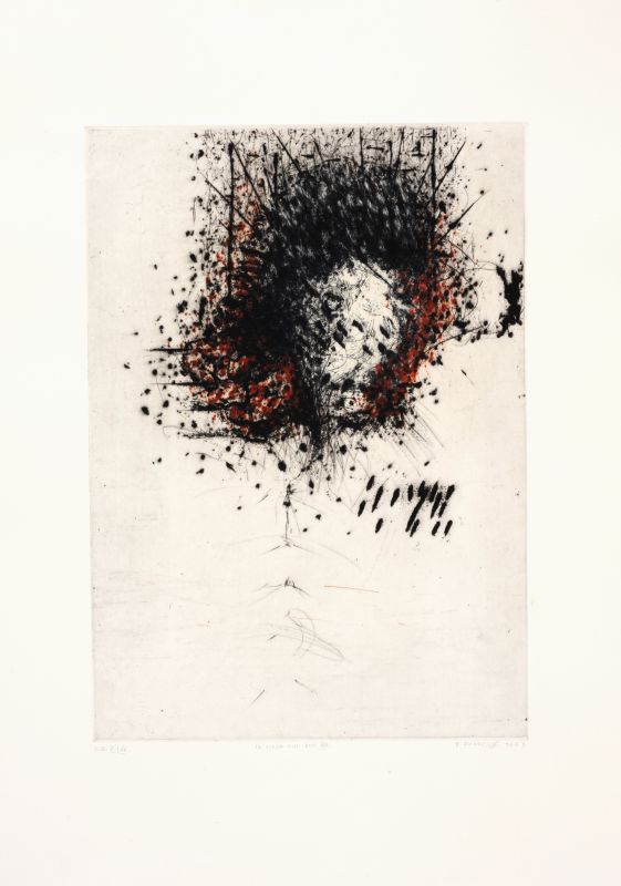 If we look at the post-media period in the graphic arts, we can describe its tendency as distancing, widening the gap between the matrix and the print. We do not even know if the matrix is still a 'negative'. It is impossible to read from a CD the manner of its production. All we know is that it is the origin, the source of the image. Kovačič has no part in that. When he holds a worked on zinc plate in his hand, he talks about wars, about registration of the struggle with the material, with the medium, with the world and with himself. Classical intaglio techniques have verified means to signify precisely that. Their survival of the deluge of the new technologies and media is the proof that they can be as persuasive today as ever.