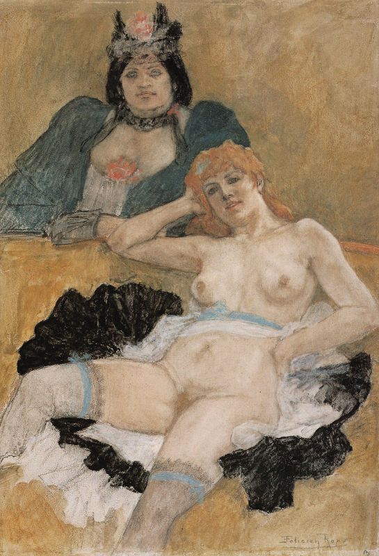 Woman, nudity and sexuality take on a significant position in Rops’ work. Rops does not hide his love for the female sex and attempts to use his art to stir the convictions of his contemporaries, which he deems to be too bourgeois and puritanical.