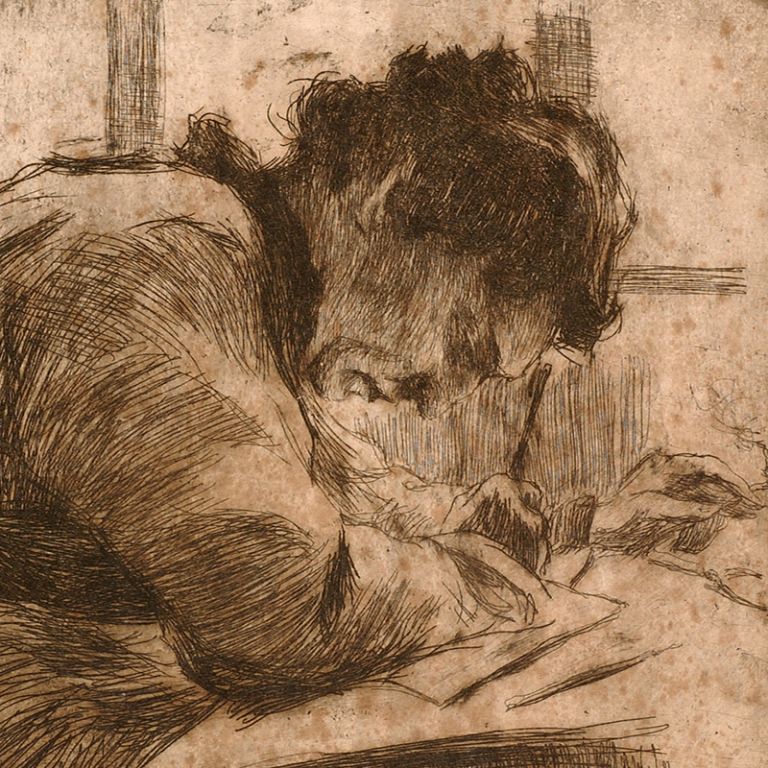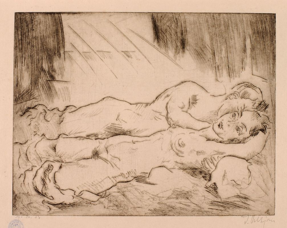 In his later life, Sternen claimed that he began to use the classical etching technique on occasions by teaching himself, and already at Ažbe’s school in around 1902/03. He also resolutely placed the time when his interest in the technique dwindled to 1906/07. He mostly tried out etching and dry-point, as well as soft ground etching (vernis mou) and monotype. A large part of his graphic prints represent copies following the erotic images of Félicien Rops, Henri de Toulouse-Lautrec, Max Klinger and probably others. He chose to emulate artists who were innovators in printmaking techniques. He regarded prints with the eyes of a painter, looking for painterly effects. Finally he limited himself to monotype only, but he always intertwined unusual treatments and additions into the technique, which makes it difficult to describe with more precision. In his bequest, several prints have been signed by his wife Rozalija Klein?Sternen. Among these, the etching At Etching draws special attention since this is the earliest example of self-reflection in Slovenian printmaking. Most of the prints by both Sternens disclose at first glance that they were not intended for the general public and are a sort of artist's proofs. Collectors, however, should be careful with individual sheets because some of the plates still exist and prints might have been occasionally pulled from them.