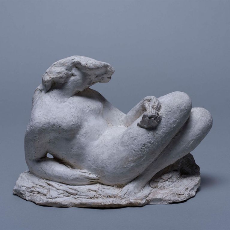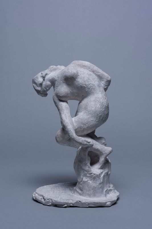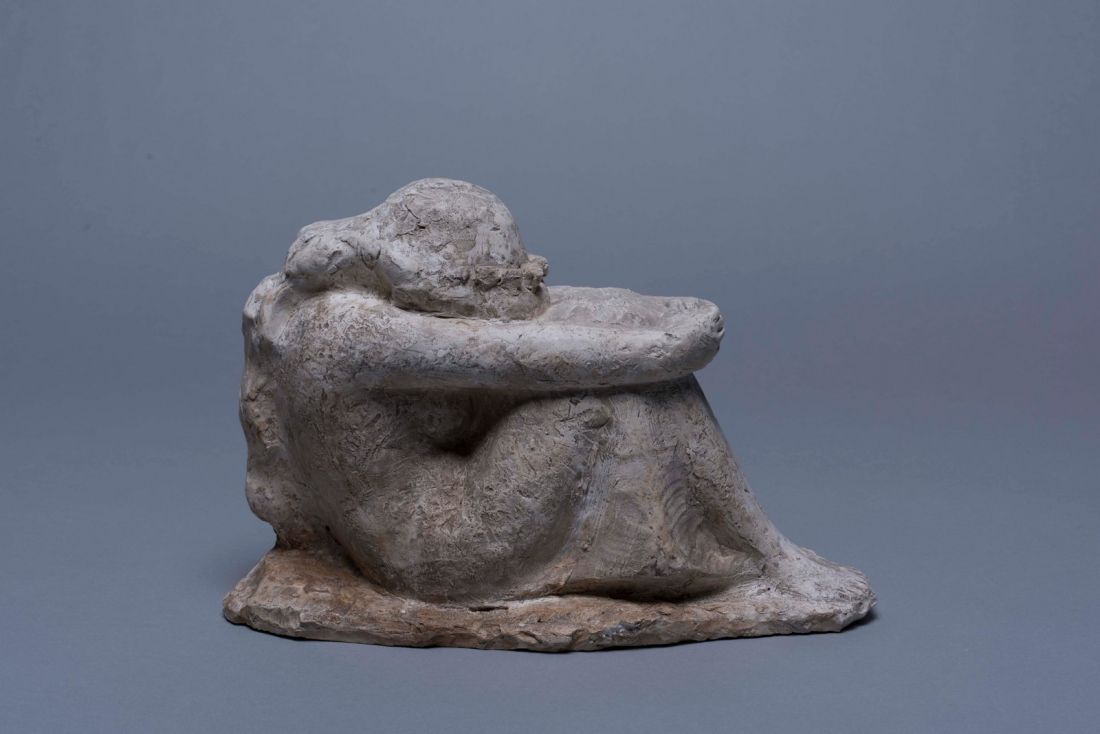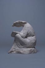 Producing memorial sculpture was hard work, so the artist let his imagination and artistic drive loose in the studio by making small female figures. Throughout his career, he often withdrew from the commissions with ideological charge into a peculiar world of small-scale works striving for harmony and beauty, which stand out from his oeuvre. Sensitive, poetic or rather lyrical spirit of Smerdu’s creations is noted by every researcher of his work. Belonging to his collection of small sculpture in baked clay, stone and bronze, which occupied the artist during his serene studio work and brought him a distinction of being a sensitive sculptor of intimate small pieces, are sitting, crouching or reclining stylised female figures, made between 1950ies and the artist’s death in 1964. Pieces, like the Reclining Female Nude, Girl with a Bouquet, Petit Dreams, Collecting Her Thoughts, Girl with a Book, Woman Crouching, Woman Sitting and Woman Standing are rounded in their own volume, and marked by soft transitions, lyricism, gentleness, mindful stillness, silence and sensitive mood.