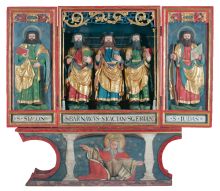 While researching the time and place of origin of this altarpiece, our attention was first captured by the missing superstructure. Delicately carved superstructures with intertwining scrollwork and a canopy in the middle were characteristic of early 16th-century altarpieces from western Carinthia. The carved decoration beneath the upper edge of the shrine features Carinthian characteristics, although the figures in the shrine and on the insides of the wings cannot be associated with Carinthian works. Emilijan Cevc recognised their general, early 16th-century southern German characteristics. The National Gallery in Ljubljana keeps two more sculptures by the same artist, St Sebastian and St Roch, from the church of St Peter above Begunje; consequently Cevc attempted to attribute the figures from the Britof retable to a carver working in Carniola. Nevertheless, the characteristics of these figures point to Friuli, or to be more precise, to the output of South Tyrolean carvers from Bruneck, who worked for patrons from Friuli (particularly Master Nicholas and Michael Parth), and of their Friulian imitators, who had already introduced certain Renaissance elements in their works. The characteristic features of these works are heavy figures, broad bearded faces, a coat covering the body like an apron and a firm, frontal composition with a distinct contrapposto. Nevertheless, this figural pattern had already been transformed into a repetitive, rigid scheme and the sculptures therefore cannot be dated to the period before 1530.
