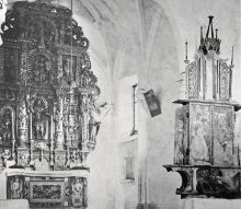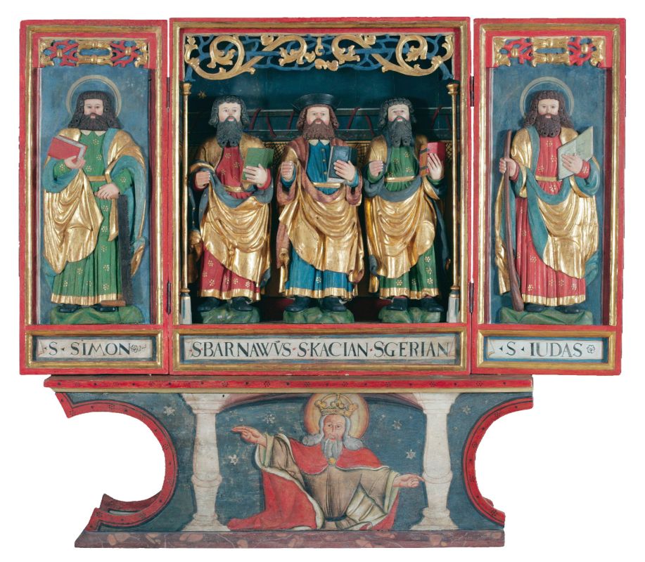 The carved altar from Britof on the Idrija River is one of very few medieval winged retables preserved in Slovenia. The main figure in the shrine cabinet depicts St Canzian, which means that the retable originally stood on the high altar in the presbytery of the church and was moved to the right side altar in the nave when the new Baroque high altar was installed. The retable consists of the shrine cabinet containing three saints – the patron saint of the church in the centre, St Bartholomew to the left and St Gereon to the right – two folding wings, each with a saint in relief (St Simon to the left and St Jude Thaddeus to the right), and a predella with a painting of God the Father. The altarpiece used to feature a superstructure that is documented in old photographs; by analogy, the main canopy contained another sculpture, probably the standing Christ in Agony. The outer sides of the wings, displayed when the altar is closed, are adorned with the Annunciation of the Blessed Virgin, depicting the angel to the left and Mary at the lectern to the right. It is evident that the shrine cabinet was also flanked with tall, narrow carved wings like those of the superstructure.