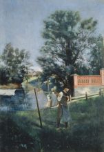 Petkovšek placed the motif of domestic errands near the edge of Kotnik's estate in Verd, where one can still find the remains of the park, sloping down towards Ljubljanica. The painting was recently restored and is characterized by intensive colours and cooler green-blue palette, typical for the French painting school.
