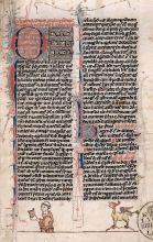 The manuscripts on show which were produced in the towns of Italy reveal variety in terms of content. The oldest manuscript, the New Testament part of the Bible (NUK, Ms 26) was produced after the mid-12th century in northern Italy and in its tendril and zoomorphic ornamentation displays typical Romanesque elements, well known also from the milieu of Normandy and England. A good century younger is the north-Italian manuscript (NUK, Ms 4) with the postscript of Papias’ Lexicon. Two manuscripts with canonical texts from the end of the 14th century are linked to Florence. However, the youngest Italian manuscript – The Venetian Chronicle with Heraldry Book of aristocratic families (NUK, Ms 159) – can be dated to the second quarter of the 16th century.