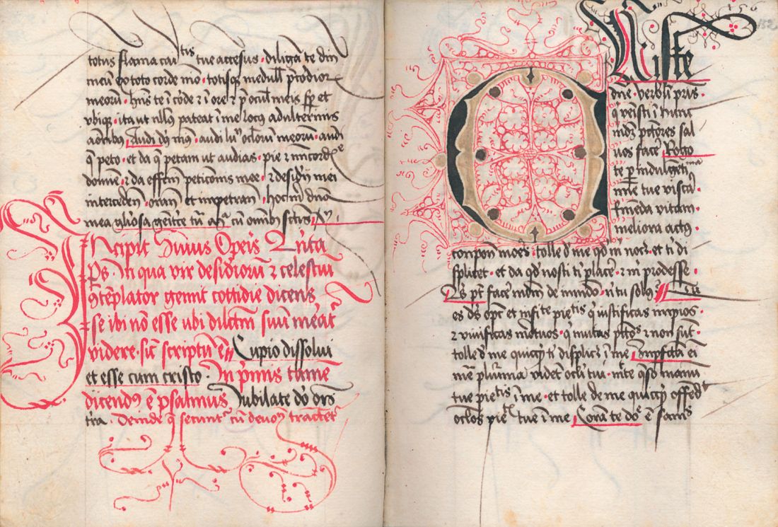 In the late 14th century the Žiče Charterhouse was amongst the most influential European monasteries and intellectual centres. In around 1400 a special style was developed here which is defined by complex fleuronnée initials, written out with pen and various coloured inks. Presented are the Prayer Book (NUK, Ms 43) and Psalter (NUK, Ms 21) from a time around 1423, and an about half a century older manuscript (with a text whose author is the mystic Henricus de Susa, NUK, Ms 27) which actually travelled from the Jurklošter Charterhouse to the Bistra Charterhouse, but was undoubtedly produced in the Žiče Charterhouse. This also bears witness to the close connections and reciprocal help that existed among Carthusian monasteries.
