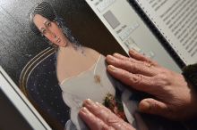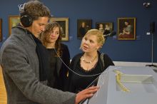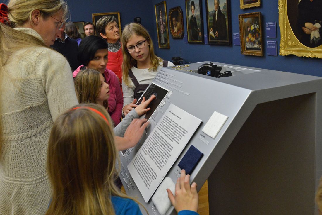 To the tactile adaptation and the legend on the display counter we added samples of three kinds of fabric - silk, plush, and fur, which Mihael Stroj so convincingly painted in the portrait. To the upper corner we chained a quizzing glass similar to the one in the picture, which can be used as a magnifying glass with the magnifying power of five. An audio narration, a large-format text, a text in Braille, and corresponding English translations have also been added.