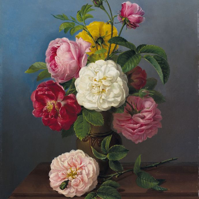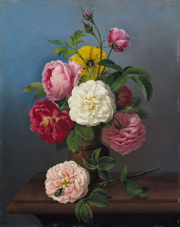 table before us proudly stands an exquisite bouquet of old sorts of roses in