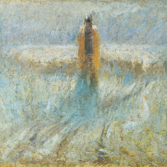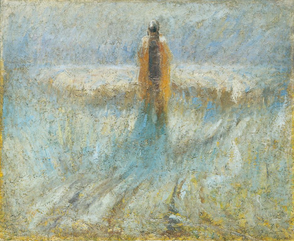 The figure of the attentive shepherd is anchored in the centre and highlighted