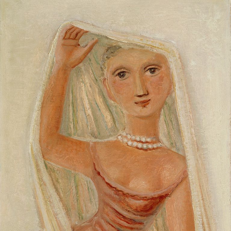 pearl necklace, which adorns the woman’s neck. The delicate fabric that wraps