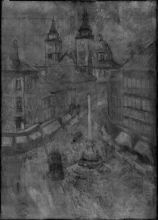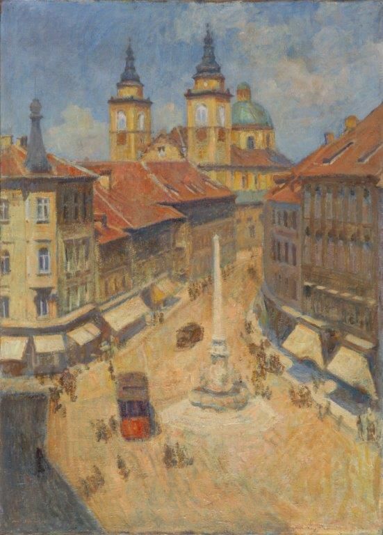 Between 1929 and 1935 Matija Jama lived in the Souvan house on the City Square (Mestni trg) in Ljubljana. The view of Šenklavž – St. Nicholas' Cathedral – opened up to him through the window of his garret studio on the fifth floor. From this perspective, a series of images was created in which the painter combined three important city monuments: the City Hall (Rotovž), the Robba Fountain and the western façade of the Baroque cathedral with its imposing towers. Of the nine versions that can be found in the documentation today, the format of the largest canvas (National Gallery of Slovenia) is twice as big (120 x 80 vs. 60 x 40 cm) as that of the smallest (Maribor Art Gallery). Compositional differences in the series of the paintings are minute.