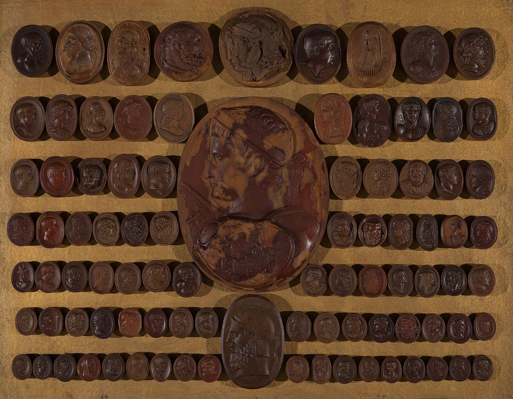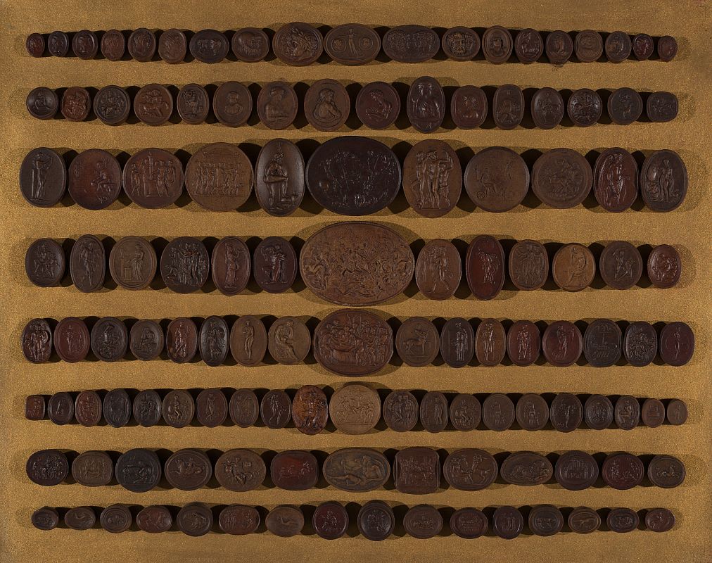 Mainly due to a great interest of art collectors, impressions of original gems came into fashion in the seventeenth century; they were made of plaster or sealing wax, because the prices of these were by far more affordable than the costs required for the originals. Collections of impressions were widespread particularly in the eighteenth and nineteenth centuries. They contained impressions of classical, Renaissance and Baroque gems as well as the so-called modern-period gems which were made in the eighteenth or nineteenth century. Looking at such collections one got the feeling he was back to ancient times. It was possible to contemplate them and imagine that one had true characters of the old world before their eyes. One of such collections, dating from the early nineteenth century, is also housed in the National Gallery of Slovenia. It was donated in 1961 by the medallist and sculptor Anton Sever (1886–1965).