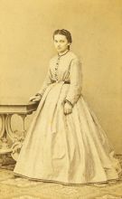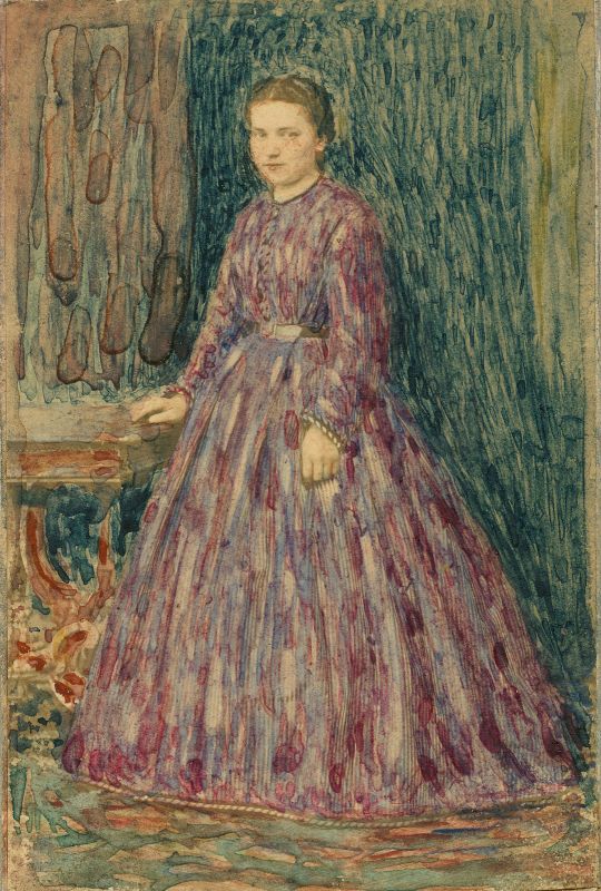 In addition to artworks by Gvidon Birolla the National Gallery of Slovenia also keeps part of the painter’s personal archive. Among the documents there are also two full-length female portraits: a photo portrait (albumen photograph, 9.2 x 5.7 cm) from the photographic studio of Ed. Lichtenstern in Trieste and a Lady in a Violet Dress, at first recognized as a gouache miniature. As concerns the latter, it has been established recently by Tina Buh, the National Gallery’s conservator-restorer, that the Lady in a Violet Dress is in fact a hand-coloured photo portrait (8.6 x 5.7 cm) and that Birolla cropped a copy of the photograph from Lichtenstern’s Trieste photo studio and heavily overpainted it. Last year, with the help of the painter’s relatives still alive, we managed to identify the depicted lady as Antonija Birolla (née Šink), the painter’s mother. According to a painter’s kinswoman now deceased, the violet dress Antonija wears in the picture, still existed in 2003 but was discarded about ten years ago due to decrepitude.