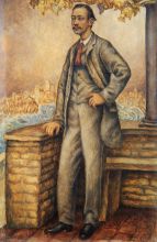 Gvidon Birolla presented his mother in the domestic environment, in her native town of Škofja Loka. He did likewise in the portrait of his father. Fortunat, or Feliks, Birolla was half- Italian, half-Croat by birth, his native town was Pazin in the Istria. The painter must have relied on a photograph when he was painting the portrait because his father had died as early as 1884, when Gvidon had only three years. The sitter is set in an open stone built porch grown with vine bearing ripe grapes; far in the background a compact town of stone houses is seen on a hill, presumably Pazin, the father’s birthplace. Father’s facial features in this full-length oil portrait – it is the same size as mother’s portrait, 30.0 x 29.5 cm – are identical to those in his chest-length portrait, figuring as a painting within a painting in the artist’s full-length portrait of Antonija Birolla, where it is shown as hanging above the chest of drawers in the background.