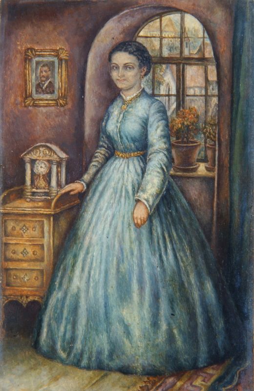 In the oil portrait of his mother Birolla retained her posture as can be seen in the portrait photograph. However, the painter changed the colour of the dress, otherwise of the same cut, to blue and transferred the sitter from the photo studio into the room of his Škofja Loka apartment: instead on the little neo-baroque table with double-volute legs from the Trieste studio, her right arm rests on a discretely decorated chest of drawers with neo-baroque base, on which a precious pendulum table clock stands, and a chest-length portrait of her husband – painter’s father – is hung on the wall above the chest of drawers; through a window in front of which the lady is set a view opens over Škofja Loka, past the Ursuline church to the castle.