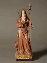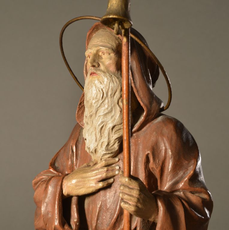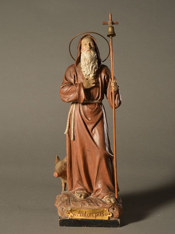 St. Anthony the Abbot (ca. 250−356) was a native of ancient Egypt. He took the decision to give away his property to the poor and go to live in solitude. He left for the mountains in the desert, persisted in complete silence for twenty years and became the leader of the first desert hermits. When his grave was found in 561 AD, his relics were taken to Alexandria, Constantinople, Rome and several places in France. He was venerated by pious societies that ran institutions, dedicated to St. Anthony, for the mentally disabled. People would bring them food, particularly pork and sausages. In this way, the donors provided themselves with protection against diseases, and St. Anthony the Abbot became a patron saint of all domestic animals. Depictions present him with a pig, a bell and a Tau cross as his attributes.