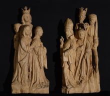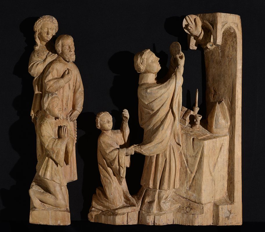 The four wooden relief scenes featuring episodes from the life of bishop Erhard of Regensburg (died c. 720) and St. Odile (died 720): The Mass of Bishop Erhard, Erhard heals Odile from blindness, The tomb of St. Erhard, Opening the tomb of St. Erhard belonged to a certain Gothic altar that was dedicated to this 8th-century missionary bishop. St. Erhard and St. Odile were worshipped as patron saints for eye diseases and headaches. Their cult spread to southern Alpine valleys during the Gothic era, while the discussed reliefs are the southernmost examples known so far of this iconography, thus originating from the area where St. Lucy of Syracuse was predominantly worshipped as the patron saint for the above-stated health problems. Her feast day is December 13, the same as Odile's. The details in the handling of the reliefs and the narrative style of the legend of St. Erhard point to a carver who was formed in the art milieu of southern Germany and Bohemia but was probably active in the Duchy of Styria.