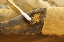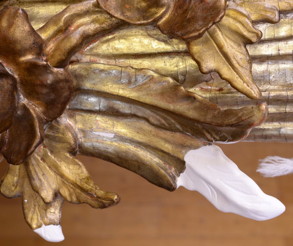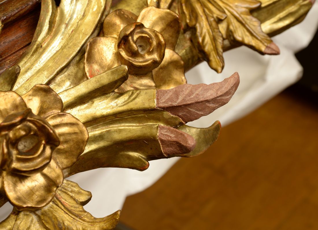 The most demanding part of the intervention proved to be the replacement of the missing parts of the wooden support. Twenty-three of the sixty-three missing flowers were made by means of moulds taken from the preserved flowers, and the missing apexes of leaf ornamentation were modelled directly. Next to be done on the replaced elements was the preparation of suitable gesso and bole layers for gilding; this was done by employing classical materials and techniques which enable gold to be burnished to achieve the adequate gleam. The specific feature of the original use of differently toned gold was also repeated on the surfaces that were re-gilded. The final appearance still had to be properly adapted to the patina of time on the surrounding original, at some points also by imitating cracks on the gilding.
