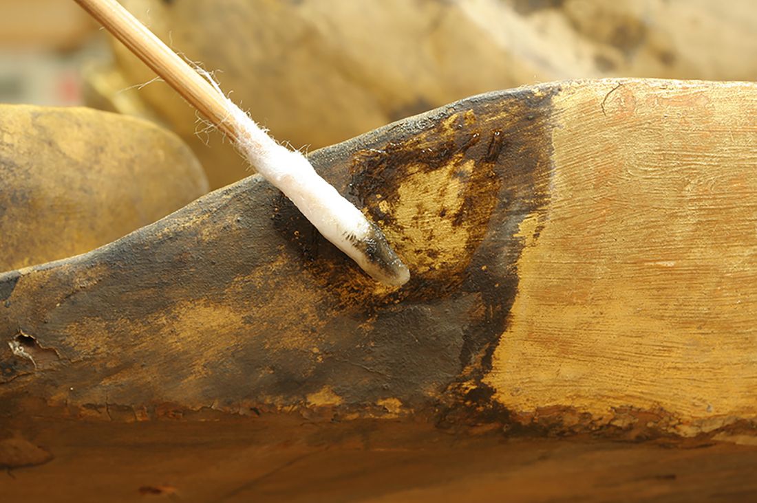 Surface cleaning was initially performed. Part of soiling material is water-soluble, which represents a problem when attempts are made to remove it from water sensitive surfaces. Hence the gilding, originally done with water-soluble binder and being also damaged and unvarnished, is even more sensitive. Several dry and/or wet methods were employed which were adequately adapted to the surface being cleaned in order to efficiently, controllably, safely and selectively separate layers of soil from the underlying layers. After the cleaning was completed it turned out that in some sections dirt was entrapped under the varnish which should have been removed to achieve effective final results of the procedure, but varnish removal was done only locally.