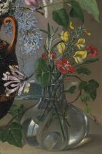 In the still life "Vases on the Window", three bouquets are placed on a shelf in front of the landscape with a streamr, a meadow, a village and hills in the background. The painting may have been created during the painter's stay on Šrajbarski turn, where she found motifs for her painting in the surrounding nature, especially in her own flower garden and the nearby forest. Most of the accurately depicted flowers do not bloom at the same time, so the painter certainly helped herself with patterns, especially with the painted tulip. The belly vase made of glass, which was a very widespread and fashionable element of floral still lifes, is also inspired by Drechsler.