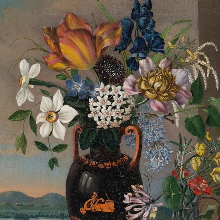 In the first half of the 19th century, the Vienna school of floral still lifes was a phenomenon in Europe of the time and the embodiment of the Biedermeier style. Biedermeier floral painting was created out of a love of nature that was prevalent across the whole of society, including the imperial family, and this, of course, encompassed both domestic and exotic flowers. It was a time of flourishing botanical and private gardens of wealthy plant lovers, and greenhouses for cultivating fashionable exotic flowers. Members of the imperial family, aristocracy and bourgeoisie became devoted amateur botanists. On the outskirts of Vienna, the refuge of countless private gardens was coveted and all this influenced the general mood, the fashion that spread to many areas of life. The Auersperg couple also followed the general trends and planted orchards, tree-lined avenues and ornamental gardens on their Dornava estate and along the Šrajbarski turn in Leskovec near Krško. For the trained painter, her own flower garden was also a source for the study of still lifes, which is reflected in the accurately painted plant species.