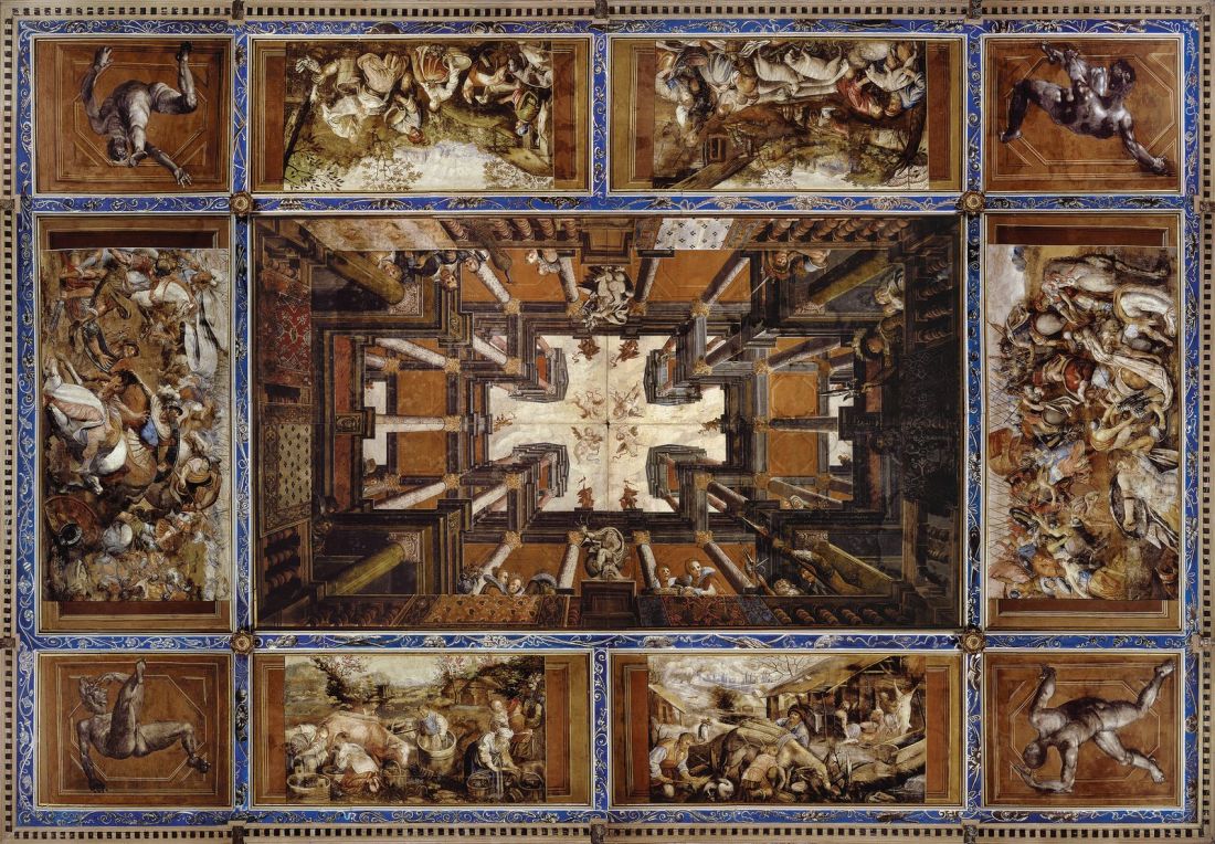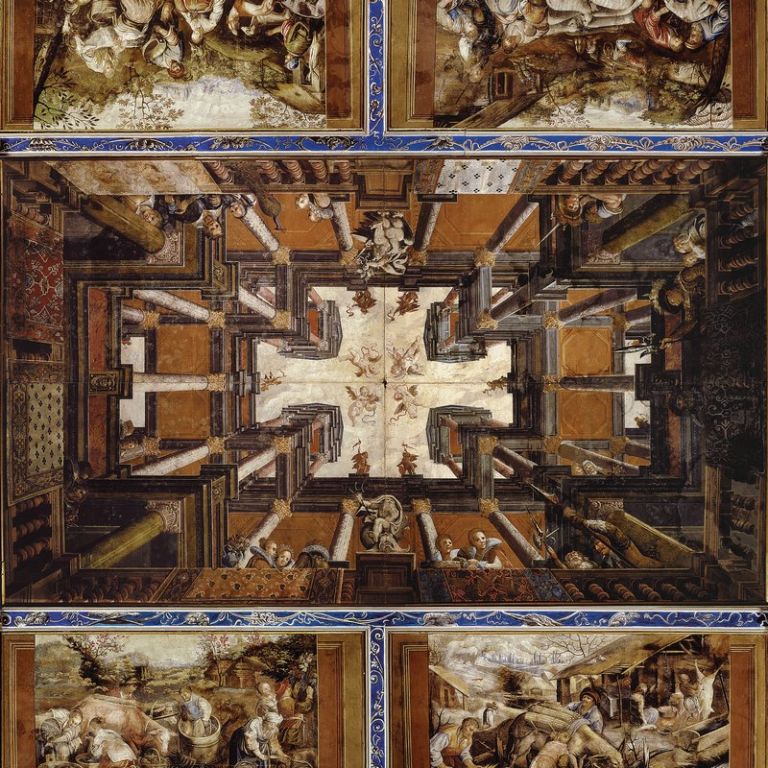 As to the motifs, the ceiling is composed of a central field with illusionistic