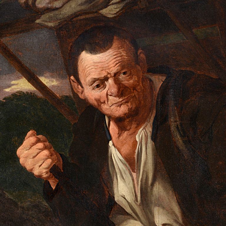 The depiction of a peasant chore brings the painting close to a realistic genre image of a simple human being. The main focus is on the male figure with a large back-basket. The summarized landscape background serves as scenery flats. The realistic and precise modelling of the serious face, hands and clothes, the man's physiognomy and the positioning and posture of the sitting figure, painted in warm colours and in subdued light in front of the dark background, closely relate this painting to the Boy with a Turkey. The latter painting was listed in the probate inventory of Marx Anton II Billichgrätz as Almanach's work already in 1731 and is, together with the two Cardplayers, the reference work of the painter. Thus, The Pedlar can become one of the crucial paintings for future research. If the similarities with the rather reliably dated Almanach's works are taken into account, The Pedlar was painted in the third quarter of the 17th century, when this mysterious itinerant artist sojourned in the Slovenian lands.