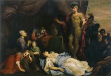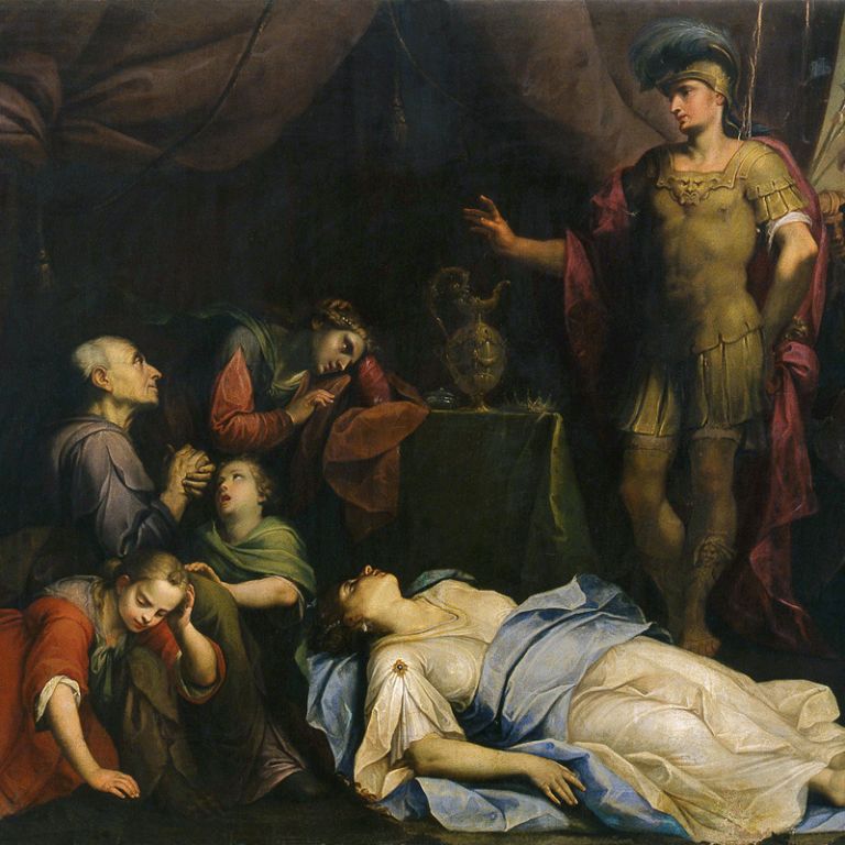 The painter was trained in literature, poetry and rhetoric and it was easy for him to interpret literary stories of Ancient and Christian world in his own way. The displayed image is probably part of a cycle about the life of Alexander of Macedon (the Great) and presents the episode when in 333 B.C. the Macedonian hero defeated Darius, King of Persia, and captured the family of the escaped king: his mother, wife and two daughters. Shortly afterwards in a military camp, Darius' wife died in childbirth. This saddened Alexander for he was unable to shower the captured queen with kindness. He visited her for the last time in a tent and ordered a funeral with full honors.