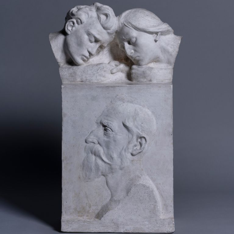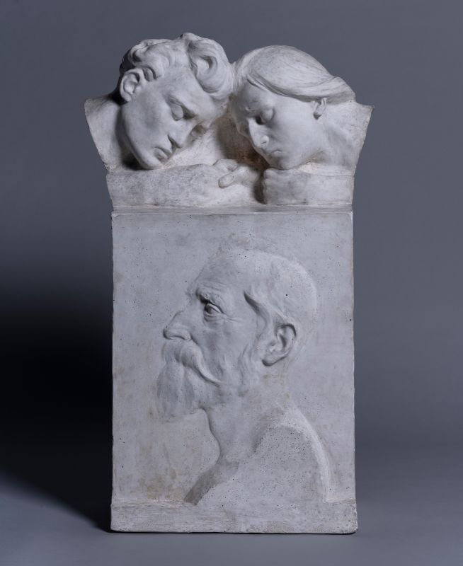 bronze plaque with a low portrait relief of the deceased in the left profile.