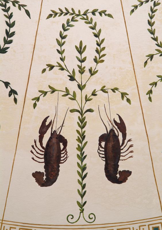 different motifs, like divine attributes (thyrsus), fruit and animals (lobster,
