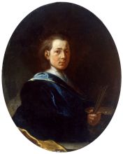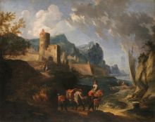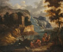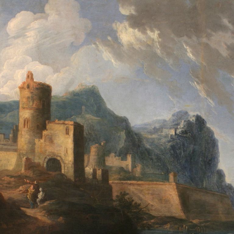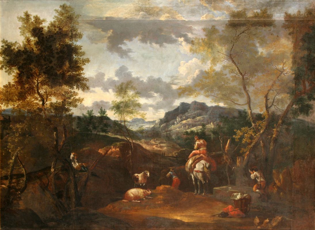 An important chapter in Flurer’s painting are landscapes, which were mainly produced for his sponsor and patron Count Attems. Embracing the views of colourful panoramas embodied by light and heavenly breadths, a mountainous and picturesque landscape with mighty cliffs predominates. The essential component is water, which gives these landscapes the rhythm of life. The staffage figures merely make up a part of the depicted idyll and given their actions and gestures only represent a snippet of the events taking place in the animated space. This is a world of Baroque fantasy, where the artist is not concerned by a topographically represented veduta, but only by the fantastically depicted landscapes, which are really, without a great narrative, merely exaggerated capricci.