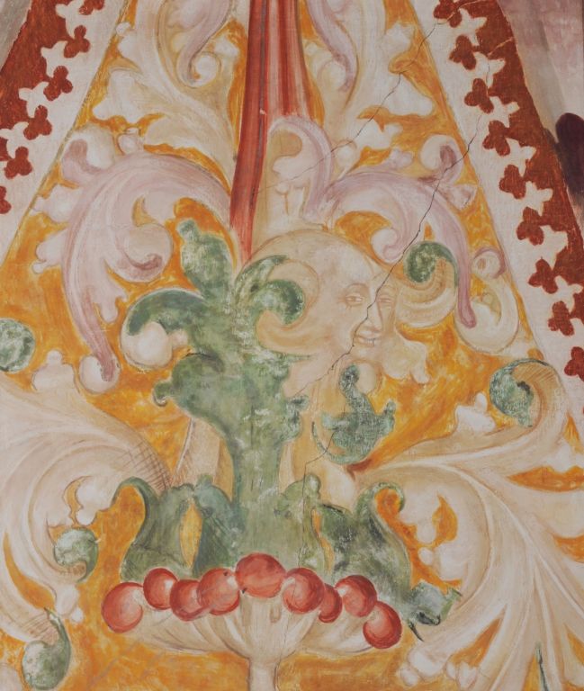 The painting belongs to the triangular vault section of the short Gothic presbytery with a ribbed vault. The entire section is covered with an artful combination of fleshy vegetation, dominated by acanthus leaves. One of the curved acanthus leaves features a monochrome painting of a man’s face with deep eye wrinkles and a slightly closed left eye – in all likelihood a concealed self portrait of the painter.