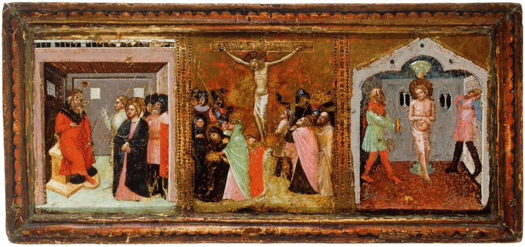 From left to right the scenes show Christ Before Herod (Luke 23, 8–12), the Crucifixion and the Flagellation. It is interesting that symmetry of the composition was given precedence over the chronology of events, since logically the Crucifixion should be in third place, at the far right. Attention should also be drawn to the damage, scratches and cuts, on some of the figures, e.g. on the two men flaying Christ and on the cross on which the Saviour hangs; such damage is often found on older Italian paintings - some of the faithful wanted to punish the executioners and evil spirits, that is, the perpetrators and instruments of the suffering of holy persons. However, despite this, the original function of the picture is not quite clear. It would appear to have come down to us preserved in its entirety and does not seem to be a predella. No similar examples of Venetian painting from the 14th century are known to us. The style of the panel painting is, however, characteristically Venetian and manifests the formal repertoire of the local tradition, which was influenced by the painting schools of the neighbouring centres, such as Padua and Verona. Many details, especially in the central scene, are very close to the work of Jacobello di Bonomo who created an altarpiece in 1375, which is now lost, for the Church of San Michele in Vicenza, and the large signed and dated (1385) polyptych in the town hall in Sant’Arcangelo in Romagna. A number of works display similarities with this polyptych; we should perhaps date our painting to the artist’s period before 1385. However we must be very careful in the attribution of this painting to Jacobello di Bonomo, in view of the uncertainty in which the development of the painter’s artistic personality is still shrouded and of the present stage of the research on this period in Venetian painting, which is still very problematic.