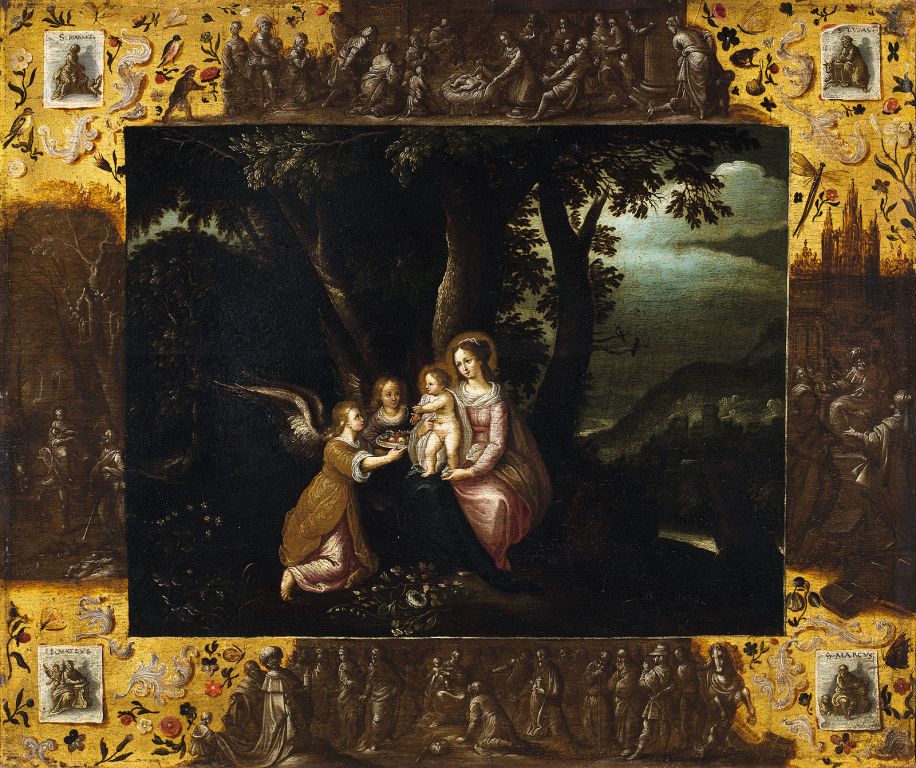 This is a painting in two parts. The central one, which is painted in several colours, represents the Virgin Mary and the Child in a landscape; they are being served by angels, one of whom is offering a platter of fruit. Around this central scene is an illusory frame in grisaille technique with various scenes which show (clockwise) The Adoration of the Shepherds, The Magi before Herod, The Adoration of the Magi and The Flight into Egypt. In the four corners of the illusory frame are painted prints representing the four evangelists, who are identified by their names and the appropriate symbolic attributes: clockwise, beginning from the top left, are John, Luke, Mark and Matthew. The motif of the central scene is characteristic of the art of the Counter-Reformation and is connected with the story of the flight into Egypt.
