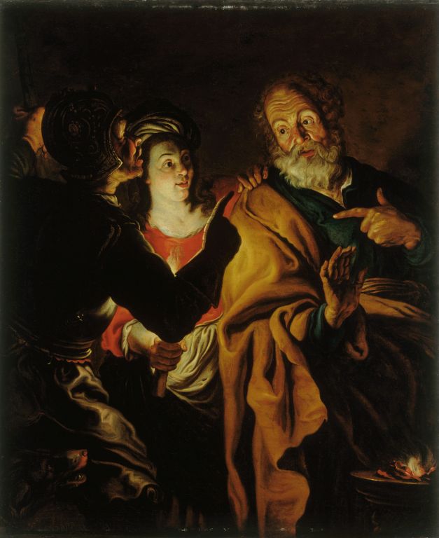 The nocturnal scene by the fire was perfectly suited to painters in the Caravaggio vein. On this upright painting Seghers depicted it with only three emphasised plastic figures and a dog’s head at the left edge. The torch which is the source of light is hidden by the soldier’s arm, while the light flows over the faces of the main figures – over the face of the girl and Saint Peter. The background is neutral, which is typical of Seghers’ early works, when he was influenced by the Caravaggists. The emphasised plasticity of the bodies and the strong contrasts of light and darkness also indicate strong influences from this direction and suggest a dating around 1620.